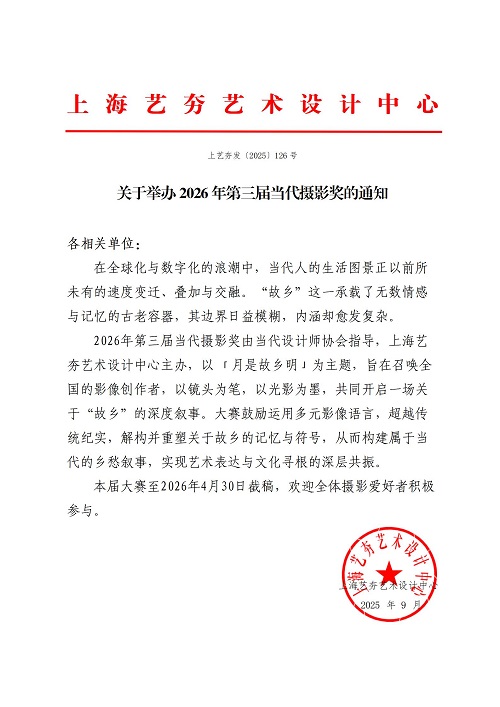 2026年第三届当代摄影奖由当代设计师协会与上海艺夯艺术设计中心共同举办,秋季赛以 「月是故乡明」为主题,旨在召唤全国的影像创作者,以镜头为笔,以光影为墨,共同开启一场关于“故乡”的深度叙事。大赛鼓励运用多元影像语言,超越传统纪实,解构并重塑关于故乡的记忆与符号,从而构建属于当代的乡愁叙事,实现艺术表达与文化寻根的深层共振。