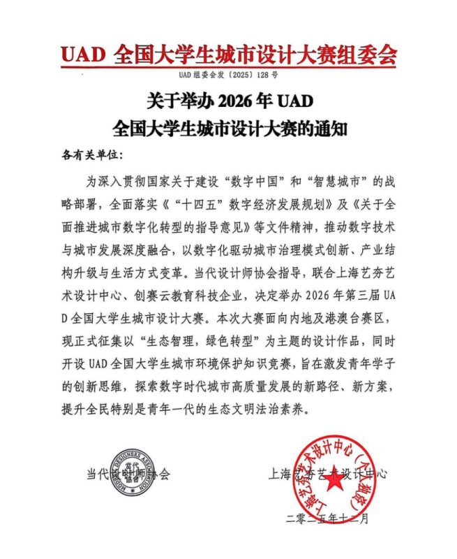 为深入贯彻国家关于建设“数字中国”和“智慧城市”的战略部署,全面落实《“十四五”数字经济发展规划》及《关于全面推进城市数字化转型的指导意见》等文件精神,推动数字技术与城市发展深度融合,以数字化驱动城市治理模式创新、产业结构升级与生活方式变革,白名单大赛网、当代设计师协会、香港高等教育出版社城乡规划学科专业指导委员会联合智慧城市发展研究中心,决定共同举办2026年第三届UAD全国大学生城市设计大赛。本次大赛面向内地及港澳台赛区,现正式征集以“生态'智'理,绿色转型”为主题的设计作品,旨在激发青年学子的创新思维,探索数字时代城市高质量发展的新路径、新方案。